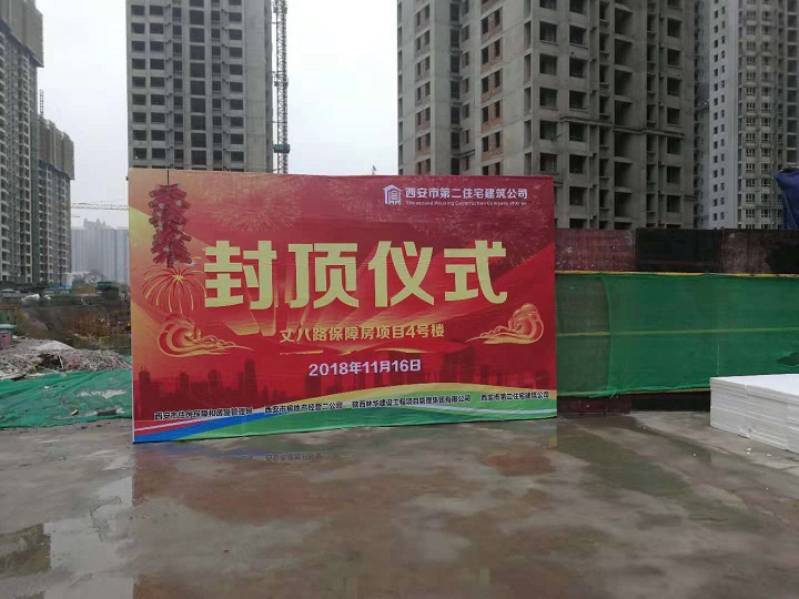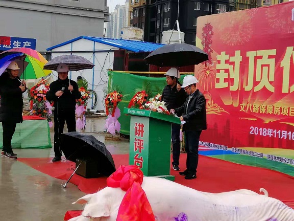 11月16日星期五丈八路保障房項(xiàng)目的施工現(xiàn)場,禮炮在片片雨云中炸響,鞭炮粘著雨花淅淅的散落著,雖然下著小雨,但是現(xiàn)場依舊人山人海,熱鬧非凡;10點(diǎn)50分隨著項(xiàng)目指揮長邢京平同志的聲音響起,丈八路項(xiàng)目封頂儀式正式開始。丈八路保障房項(xiàng)目4號樓主體順利封頂,標(biāo)志著丈八路項(xiàng)目再一次完成了重要節(jié)點(diǎn)性的施工任務(wù),這是所有現(xiàn)場施工人員堅(jiān)持不懈的努力下共同完成的勞動成果;開發(fā)單位西安市經(jīng)營二公司書記王備戰(zhàn)同志在講話中對現(xiàn)場施工人員的工作予以高度肯定,并再三叮囑大家要再接再厲完成好后續(xù)工作,參加本次活動的還有建設(shè)單位各級領(lǐng)導(dǎo),監(jiān)理單位總監(jiān)及各專業(yè)工程師,施工單位西安市第二住宅建筑公司副經(jīng)理杜軍、技術(shù)總工劉琪、指揮長邢京平、現(xiàn)場負(fù)責(zé)人陳衛(wèi)民及各級現(xiàn)場施工人員。