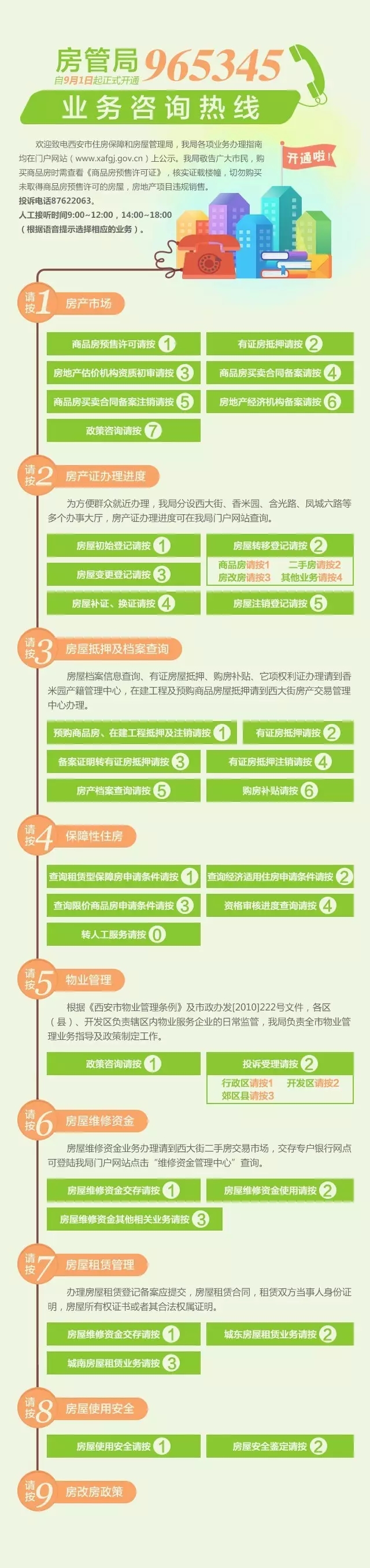 熱線的受理范圍包括:房產市場、房產證辦理、房產抵押及檔案查詢、保障性住房、物業管理、房屋維修資金、房租租賃管理、房屋使用安全、房改房政策九大類問題。